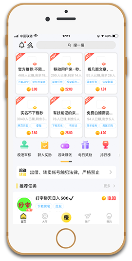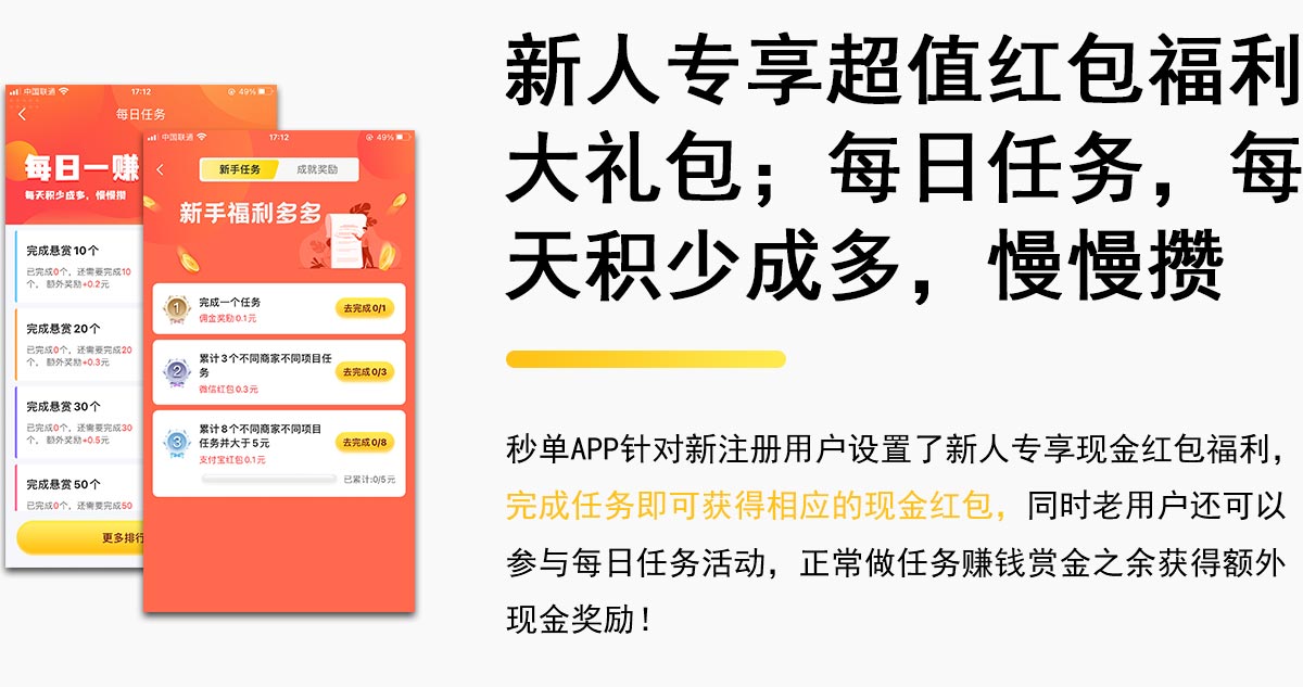 秒单(官方正式版)悬赏平台又叫做秒单(官方正式版)极速版APP,是由重庆市升隆汇金科技有限责任公司推出的做悬赏任务赚钱软件,任务多多、奖励多多,随时提现、极速到账,每天带你轻松赚钱。秒单(官方正式版)悬赏平台相比于同类平台来说,最大的优势就是形成了矩阵联盟,秒单(官方正式版)旗下有多个悬赏平台,如得帮、帮多多、熊猫赚、兼蛋等等,虽然单个平台比不上趣闲赚-安卓端、赏帮赚(官方版)等大平台,但是秒单(官方正式版)联盟旗下的平台之间互通,也就是说如果你在其中一个平台上面发布了任务,那么其它几个平台也会同步发布,所以任务量是非常多的,秒单(官方正式版)极速版赚钱软件让你轻松赚零花!